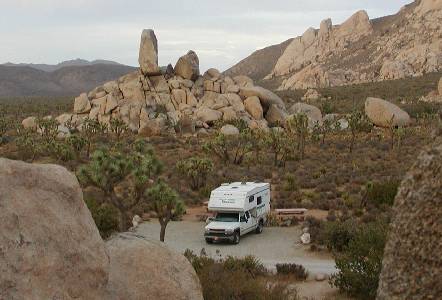 Die Ecke nennt sich übrigens White Tank. Genau die, die Tom Russell in seinem Lied Joshua Tree besingt (das Ihr im Hintergrund hört). Mitten zwischen diesen Felsen wurde ein Campingplatz angelegt, jedes Plätzchen hat seine eigenen Felsen. Da das Campen dort nicht mal etwas kostet, hatten wir gerade noch Glück, den vorletzten freien Standplatz zu ergattern.